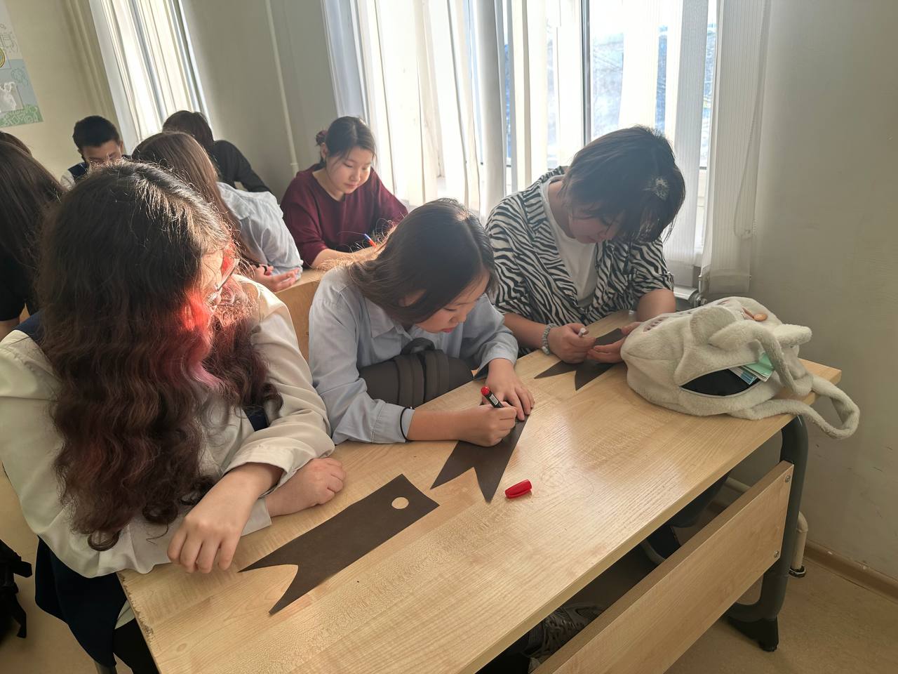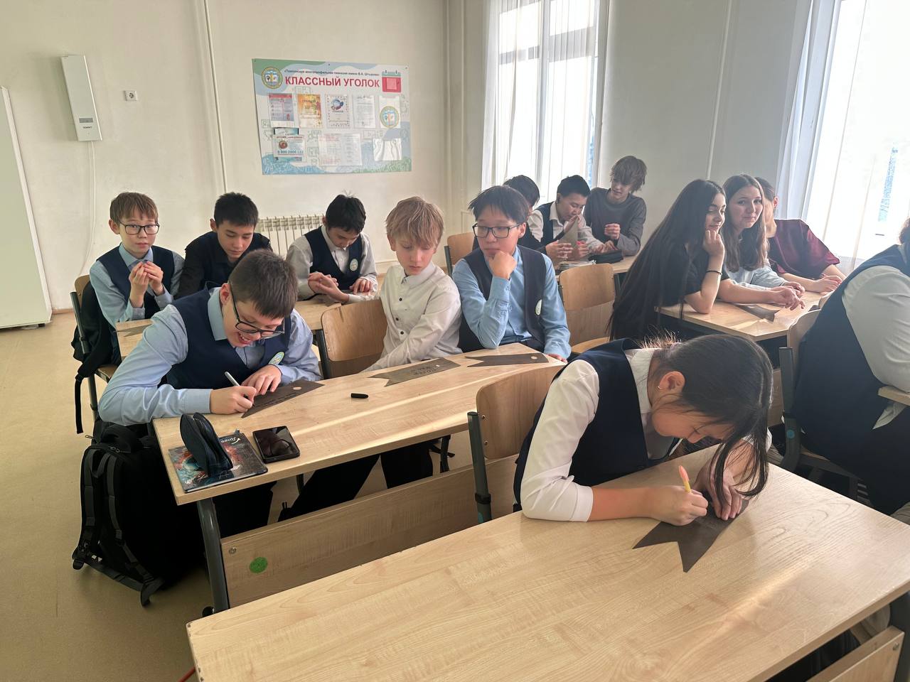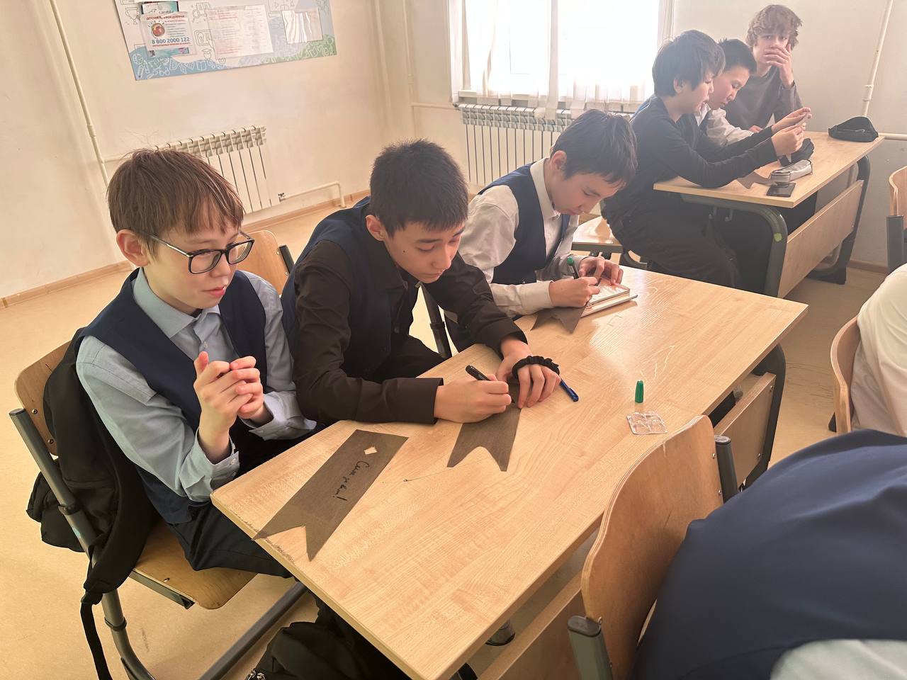 В завершение встречи библиотекарь Неймохова Инна Егоровна предложила гимназистам принять участие в акции поддержки: на небольших флажках для маскировочных сетей участники написали тёплые слова и пожелания нашим воинам – здоровья, сил, мужества и скорейшего возвращения домой. Эти флажки будут переданы вместе с гуманитарной помощью в зону специальной военной операции как символ нашей поддержки и благодарности.