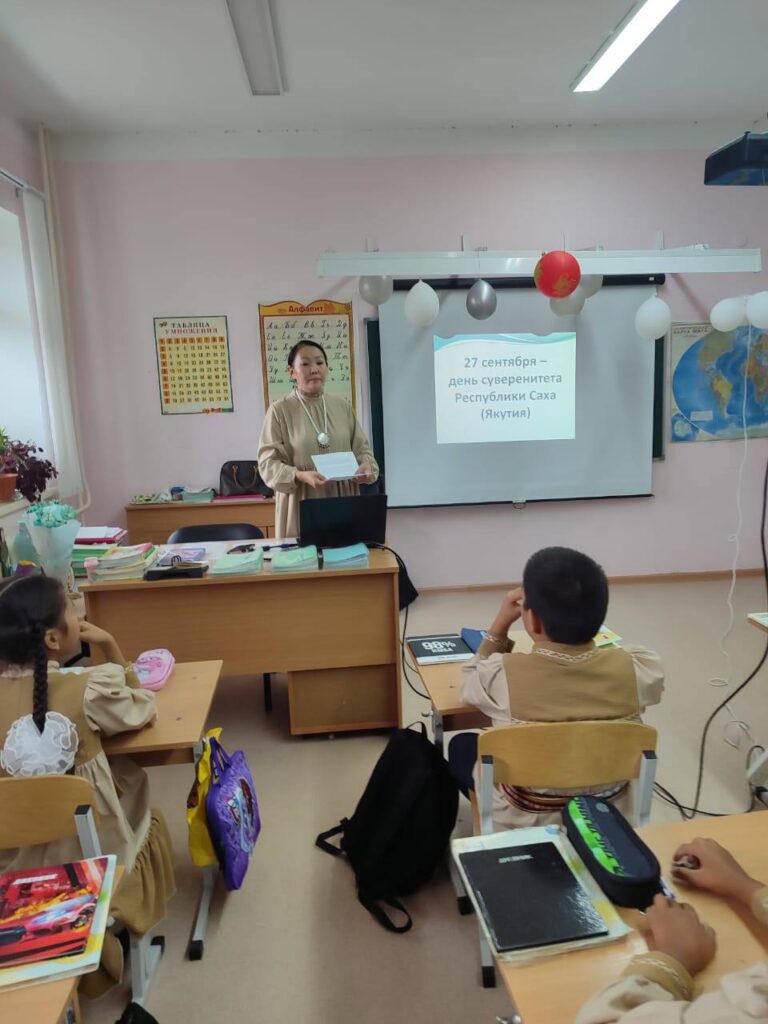 27 сентября — знаменательный день для всех жителей нашей Республики. В этот день была провозглашена Декларация о государственном суверенитете, что ознаменовало новый этап в истории развития Якутии. Баягантайская сельская библиотека им. Л. Л. Холмогоровой совместно с ЦНТ «Баягантай» провела информационный час ко Дню Суверенитета Республики Саха Якутия. Библиотекарь Анна Ивановна рассказали о важности этого памятного дня, который является одним из главных праздников, а также о людях, внёсших большой вклад в развитие нашей Республики. Речь шла о политических деятелях, стоявших у истоков её образования. Были отмечены важные факты из истории, географии и природы Якутии, также её государственные символы. Также мероприятие сопровождалось викториной, где были заданы вопросы об истории и интересных фактах Якутии. В конце мероприятия специалист ЦНТ «Баягантай» Татьяна Дмитриевна сыграла на хомусе и рассказала о фольклоре Якутии. Дети активно участвовали в беседе и показали отличные знания. Всех поздравляем с Днем Государственности Республики Саха (Якутия)