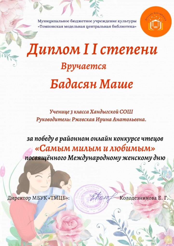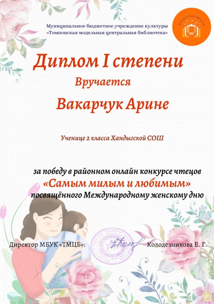 • I место — Вакарчук Арина (МБОУ «Хандыгская средняя школа»);