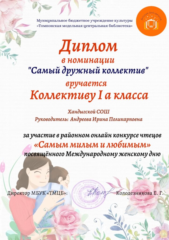 • «Самый дружный коллектив» — коллектив 1а класса (МБОУ «Хандыгская средняя школа»).