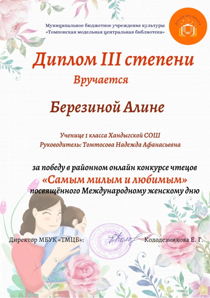 • III место — Березина Алина (МБОУ «Хандыгская средняя школа»).