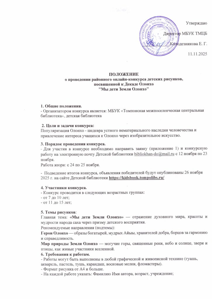 Положение районного конкурса рисунков «Мы дети Земли Олонхо», посвященной к Декаде Олонхо.