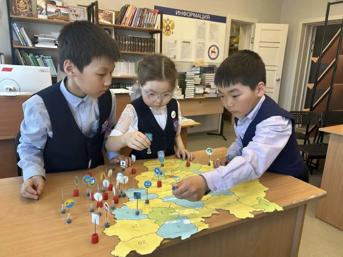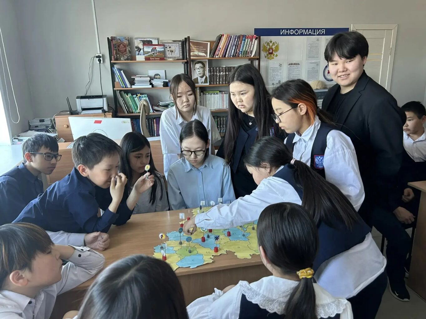После беседы прошла игра «Моя Республика», где ребята отвечая на вопросы находили районы, города Якутии на карте по их гербам.